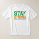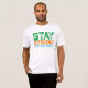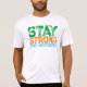 Un t-shirt avec le slogan motivant "Stay Strong Stay Motivated" en vert, orange et bleu, en caractères gras et en relief.