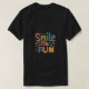 Le design des t-shirts comporte le texte "Smile It's Fun" en caractères gras et colorés. Les lettres sont disposées dans un agencement amusant et empilé avec les mots "Smile" et "Fun" respectivement en haut et en bas. Le mot "It's" est placé entre les deux, en utilisant une police plus petite et contrastée. L'ensemble est joyeux et attrayant, avec des couleurs vives et une typographie ludique qui dégage un sentiment d'amusement et d'optimisme.