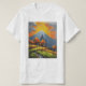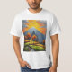 Essa é uma imagem de uma pintura, essa é uma criação minha com gerador de imagens, mostra o sol se pondo atás da montanha ao mesmo tempo que está chovendo, arvores vermelhas com paisagens verdes e o contraste das cores das nuvens com a montanha e a paisagem, a camiseta é de excelnte qualidade ideal para presentear uma pessoa.