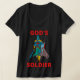 Ce t-shirt à col vif pour femmes contient les mots "Soldat de Dieu" en caractères gras et des lettres rouges avec un soldat en armure pleine tenant une épée plus un bouclier au centre avec un thème religieux. Ce tee est confectionné et cousu latéralement pour une femme en tissu léger pour le confort.