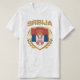 Le drapeau national de la Serbie est imprégné d'un faux bouclier doré qui lui-même repose sur des feuilles de faux lauriers or, Le nom du pays est ajouté au-dessus de l'image.