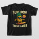 Un vif ananas en caricature semi-réaliste portant des lunettes de soleil rétro surfe sur une vague arc-en-ciel néon sous un ciel turquoise pastel. Le slogan "Surf Now, Think Later" ajoute une ambiance amusante à la plage. Une typographie audacieuse inspirée de panneaux de surf vintages et de subtiles lignes rétro des années 80 en font un design parfait pour les amateurs d'été, de surf et de style tropical.