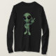 Un grand alien vert nous donne un grand signe de paix - le signe à deux doigts V, symbole de paix à travers le monde.