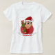 T-shirt féminin avec l'illustration d'un joli petit garçon souriant et heureux, il porte un costume de Père Noël rouge et blanc et tient un cadeau; avec le texte modifiable modèle pour votre nom ou message, Noël design
