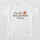 Chemise mignonne et élégante "C'est mon anniversaire d'Halloween !" pour les enfants. Comprend des lettres modernes orange et noir, un citrouille Jack-o'-lantern souriant, et du texte personnalisé qui peut être personnalisé pour l'année / numéro d'anniversaire.