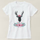 Un t-shirt avec tête de cerf noir avec de grands bois. Les lignes géométriques à l'intérieur de la face du cerf ajoutent une touche unique. Des fleurs roses colorées et des feuilles vert menthe forment une couronne sur la tête et un bouquet floral sous le cou. Une ambiance champêtre et rustique.