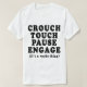 Crouch, Touche, Pause, Engagement ! C'est un truc de rugby, où l'arbitre appelle chaque élément du début d'un scrum. C'est aussi une phrase assez sombre et intéressante ! Également disponible sur les tee - shirts foncés, ainsi que sans le commentaire qualifiant en bas. En d'autres termes, si vous osez, obtenez celui qui NE DIT PAS "c'est un truc de rugby" ! Cherchez-le dans la section SPORTS de notre boutique chez greenbaby tee - shirts!