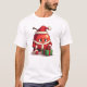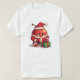 une pomme rouge caricaturée portant un costume Père Noël plein de vitalité, avec une garniture blanche moelleuse et un chapeau de Père Noël en triste position et il regarde la boîte cadeau