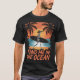 Ce t-shirt noir présente une représentation graphique d'un squelette portant un casquette et une planche de surf sur une plage. Des palmiers, un coucher de soleil sur l'océan, et le texte "TROUVEZ-MOI DANS L'OCÉAN" en orange complètent le design. On y trouve une interprétation humoristique de l'après-vie à la plage.