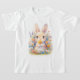 Un mignon lapin aux yeux larges tient une fleur jaune tout en étant entouré d'un tableau coloré de fleurs. Des couleurs pastel douces et des ombres douces donnent à la scène une qualité fantaisiste et sereine.