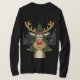 Un joyeux renne de caricature au nez rouge vif et au grain ludique est habillé d'un casquette marron classique. Il se dresse sur fond de sapins verts et noirs stylisés, avec des flocons de neige qui tombent en douceur. La texture rustique de l'illustration lui donne une ambiance chaleureuse et vintage, parfaite pour des fêtes festives ou des motifs douillets de pull.