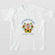 Un t-shirt d'enfant coloré met en vedette une fille ukrainienne de style art populaire au costume traditionnel avec de grandes fleurs de soleil et le salut national "Gloire à l'Ukraine ! Gloire aux héros !" en anglais et en ukrainien. Bordures bleues et jaunes du drapeau ukrainien
