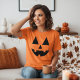 Ce joyeux visage citrouille présente des yeux noirs jack-o-lanterne, le nez et la bouche sur un t-shirt orange vif. Portez le costume d'Halloween pendant toute la saison ou comme votre costume préféré.