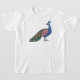 Bold peacock design with saturated blue body and ornate multicolored tail with circular eye patterns; a statement print for apparel and premium gifts.