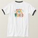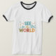 Le texte "See the World" s'étire à travers la chemise comme un lever de soleil époustouflant. Les lettres pourraient être un gradient vibrant, commençant par des oranges chaudes et des roses pour "Voir" et passant au bleu cool et aux violets pour "Monde". Cette conception évoque la promesse de nouveaux débuts et aventures sur différents horizons.