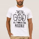 This stylish and faith-affirming apparel design features the powerful inspirational quote, "WITH GOD ALL THINGS ARE POSSIBLE." The message is rendered in high-contrast black typography against a clean white T-shirt background, creating a clear and impactful declaration of belief. The design uses a mix of bold, hand-drawn, and playful script fonts, with the word "GOD" being the largest and most prominent. The letter 'O' in 'GOD' is cleverly replaced by a stylized cross graphic, emphasizing the central role of Christ in making things possible. The text is framed by small decorative stars and flourishes, adding a gentle, appealing touch. This versatile T-shirt design is a perfect way to express unwavering faith, hope, and conviction, serving as a public reminder that nothing is impossible with God. It is ideal for casual wear, church events, or as a thoughtful, meaningful gift for anyone seeking spiritual encouragement and motivation.
