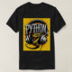 t shirt design, Create a menacing black t-shirt with a full-length Python motif inspired by the aesthetics of heavy metal music. The artwork features an elegant style, Golden and light green python coiled sinuously, its scales shining in the dim light. Python's mouth is wide open, revealing rows of sharp teeth dripping with blood, exuding a raw feeling, primitive aggression, bright sky and big sun in the background, improving the sinister atmosphere of the design. Python's eyes shine with a malevolent glow, capturing the essence of danger and violence. The overall style is bold and intense, embodying the dark and edgy spirit of heavy metal music.