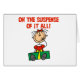 Un T-shirt design de Noël coloré et adorable et d'autres vêtements de vacances avec une petite figurine en bâton avec un grand cadeau et le texte rouge qui dit "Oh The Suspense Of It All!".