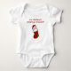 Un bébé dans un bas de Noël et le texte de style enfant sur les T-shirts, costumes, sacs fourre-tout, cartes, et plus !