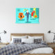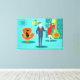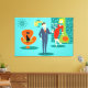 Chérie, je suis à la maison ! Ce dessin rétro Space Age Couple Stretched Canvas Print vous fera sentir envieux du couple de dessin animé sur une impression de toile étirée! L'aménagement est composé d'un arrière - plan turquoise en briques turquoises et d'une cheminée à cônes vert olive. Un chat noir élégant est assis sur une chaise orange élégante. Il y a une horloge murale turquoise, starburst et une lampe pendentif à deux étages dans les tons jaune, bleu et noir. A l'avant et au centre, un homme d'affaires distingué, martini swilling, en costume bleu et cravate orange. À son côté, la bombe blonde d'une femme trophée porte une robe de torse rouge et tient un plateau de martinis. Va-va-va-voom !