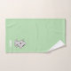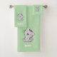 Joli chaton tabby et nom du texte sur le kit de serviettes de bain vert clair.