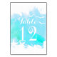 Abstraite moderne aqua bleu aquarelle splash avec étoiles de mer et mouettes de plage numéro de table de mariage carte place avec une peinture à l'aquarelle peinte à la main avec texture dans les tons d'aqua bleu et turquoise, deux étoiles de mer et mouettes en blanc et texte en blanc. Cet élégant design décontracté et élégant est un modèle entièrement personnalisable, parfait pour votre plage d'été ou mariage de destination. Notez qu'il ne s'agit que d'une image d'aquarelle et non d'une texture réelle.
