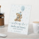 Ours d'aquarelle tenant le baby shower bleu ballon signe de bienvenue pour le baby shower garçon. C'est un baby shower garçon.