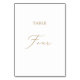 Cette délicate calligraphie dorée table quatre numéro de table est parfaite pour un mariage moderne. Le design minimaliste romantique présente une belle et élégante typographie de champagne jaune doré sur un arrière - plan blanc au look épuré et simple. La carte s'imprime à l'avant et à l'arrière (double face). Les autres numéros de tableau de la collection sont vendus séparément.