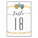 Carte de numéro de table de mariage de plage d'été en polygone de feuille d'or et coquillages. Il présente du texte en écriture cursive calligraphie manuscrite, un cadre polygonal doré et trois coquilles en beige et bleu sur la partie supérieure.