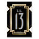 Cette élégante table de mariage numéro treize est dans un style Art déco vintage des années 1920. Le design graphique audacieux est présenté en noir et blanc classique avec des accents en faux or subtilement ombragés. Un faux numéro d'apparence de diamant dans une police correcte de période forme le point focal de cette carte.