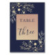 Carte de numéro de table bleu marine élégante ornée d'accents floraux dorés romantiques et d'un cadre doré rose doux. Idéal pour rehausser votre décor de réception de mariage avec élégance et charme.