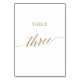 Cette élégante calligraphie dorée table trois numéro de table est parfaite pour un mariage simple. Le design neutre présente une carte minimaliste décorée avec une typographie romantique et fantaisiste de feuille d'or. La carte s'imprime à l'avant et à l'arrière (double face). Les autres numéros de tableau de la collection sont vendus séparément. Remarque : Ce design ne comporte pas de véritable feuille d'or. C'est un graphisme de haute qualité fait pour ressembler à du papier doré.