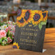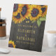 Ferme de campagne rustique personnalisée mariage table de piédestal panneau d'accueil avec de beaux bouquets de tournesols jaune or avec feuillage vert naturel et deux petits coeurs dorés sur un arrière - plan de grange brun foncé. +++++++++++++++++++ Facile à customiser avec les noms de mariée et de mariée, date et lieu. ++++++++++++++++++ Convient pour l'été ou l'automne jardin extérieur ou jardin cérémonies et réceptions mariages.