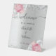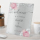 Un signe de bienvenue mariage. Un arrière - plan faux argenté. Décoré de faux brillants argentés et de fleurs roses et blanches, rose. Personnalisez et ajoutez vos noms et la date du mariage.