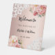 Bienvenue dans une mariage romantique et élégante. Un arrière - plan rose chic en or. Décorée de fleurs roses, de dentelle rose et blanche. Personnalisez et ajoutez les noms de la mariée et du marié ainsi qu'une date.