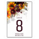 Bouquet floral d'aquarelle bordeaux et jaunes, moderne et élégant, à l'ombre d'une douce épaisse sur ce panneau de numéro de table avec des éclaboussures et des éléments dorés brillants, avec vos prénoms et votre date sous une police moderne.