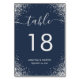 Elégante carte de numéro de table bleu marine et argent mariage avec une police de caractères moderne et confetti argent sur un arrière - plan bleu marine. Éléments correspondants disponibles.