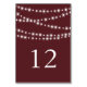 Il s'agit du numéro de table de coordination pour la collection Mariage Marsala Twinkle Lights. Des lumières scintillantes ornent cette carte, sur un arrière - plan branché couleur marsala.