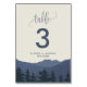 Cette retraite à la carte numéro de table montagne est parfait pour un mariage moderne. Le design se compose d'une chaîne de montagnes bleu serein avec une forêt d'arbres à feuillage persistant au premier plan. La carte s'imprime à l'avant et à l'arrière (double face). Ajoutez chaque numéro de table dont vous avez besoin à votre panier individuellement.