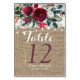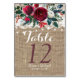 Numéro de table de mariage rustique d'hiver élégant (deux faces) avec texte modifiable avec des pivoines bordeaux et blancs foncés avec feuillage saisonnier vert pin, des cordes de lumières scintillantes et une bordure en dentelle blanche sur un arrière - plan beige imitation burlap. Idéal pour vos fêtes de Noël / hiver élégant pays rustique, ferme ou cottage à thème de mariage réceptions.
