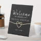 Elégant, simple tableau noir et blanc Fête des mariées de bienvenue panneau de piédestal avec faux coeur de corde or et script de calligraphie moderne.