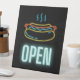 Le texte "Open" bleu néon avec silhouette de hot-dog néon sur arrière - plan noir fait de ce design un grand design pour personnel et une variété de restaurants et de restaurants