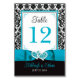 Cette carte de numéro de table mariage damassé noir et blanc double face romantique a l'image d'une paire de coeurs unis au-dessus d'un ruban bleu turquoise et d'une image arc qui traverse la partie inférieure de la carte. Le numéro de table, les noms de la mariée et du marié, et la date du mariage sont tous imprimés de chaque côté en noir, blanc et turquoise. **VOUS DEVEZ CHANGER LE NUMÉRO DE LA CARTE POUR CHAQUE NUMÉRO DONT VOUS AVEZ BESOIN, L'AJOUTER À VOTRE PANIER, PUIS RETOURNER ET RÉPÉTER LE PROCESSUS POUR CHAQUE NUMÉRO DONT VOUS AVEZ BESOIN. Si vous avez besoin d'autres articles correspondants, envoyez votre demande par courriel à niteowlstudio@gmail.com ou utilisez la fonction conversation Zazzle pour entrer en contact.