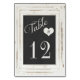 Il s'agit d'une carte de numéro de table mariage qui comporte un arrière - plan de tableau noir entouré d'un cadre blanc en difficulté. Parfait pour un mariage à thème vintage ou rustique.