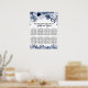 Le motif floral bleu-duvet contient de nombreuses nuances de bleu, du bleu indigo foncé au bleu pâle clair. S'il vous plaît trouver votre siège est écrit en gras et les noms des couples mariages sont écrits dans une police de caractères fantaisie et en gras.