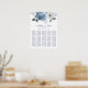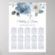 Tableau de sièges mariage bleu rose floral avec élégante calligraphie manuscrite bleu marine et typographie classique, et une touche élégante de roses aquarellés dans une palette de couleurs bleu et ivoire luxuriante sur un arrière - plan blanc. Conçu exclusivement pour vous par Happy Dolphin Studio.
