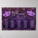 Carte de siège pour une mascarade Un motif de dentelle fleurie violette profonde en tant qu'arrière - plan. Décoré avec de la poussière de parties scintillant imitation et des masques masqués. Personnalisez et ajoutez les noms des invités. 5 tables.