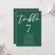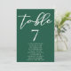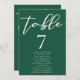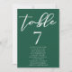 Ce solide numéro de table mariage vert émeraude avec des noms présente un script blanc classique pour un couple se marier dans une forêt ou un autre lieu naturel. Célébrez votre amour avec cette couleur tranquille et coordonnez-vous avec notre carte de sièges minimaliste de typographie correspondante.