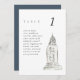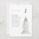 Cartes graphiques chic avec numéro de table mariage et aquarelle représentant le Chrysler Building de New York. L'association de l'aquarelle peintre et de la typographie chic est un joli combo amusant.