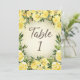 Elégant et romantique jaune floral et feuillage avec parties scintillant d'or réception de mariage numéro de table 5"x7", imprimé sur l'avant et l'arrière. Concevez-en un pour chaque table. Contactez-moi pour obtenir de l'aide sur vos personnalisations ou pour demander des produits Zazzle correspondants ou coordonnés supplémentaires pour votre douche ou d'autres événements mariages.